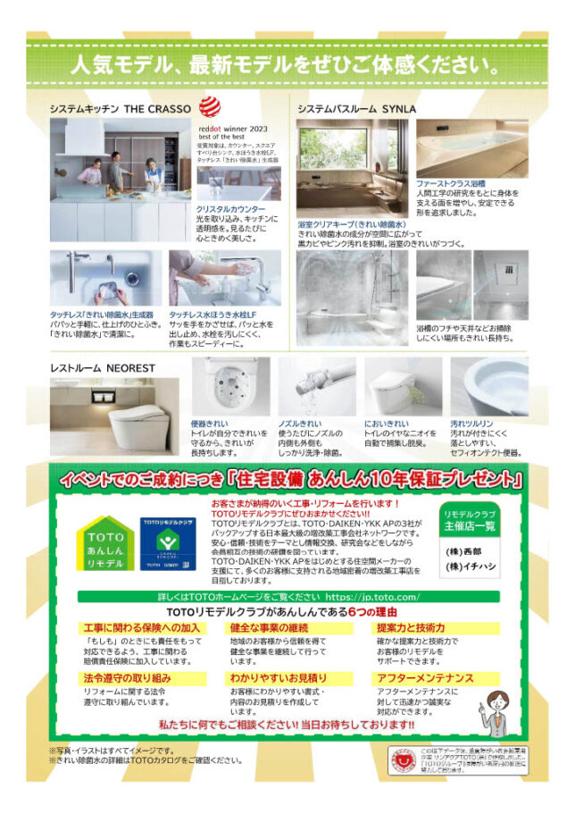 さらに、本イベントでご成約いただいたお客様には、大きな特典をご用意しました。 通常よりも長く安心が続く「住宅設備 あんしん10年保証」をプレゼントいたします! リフォーム後のアフターメンテナンスを重視される方には、見逃せないチャンスです。